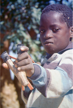 Left to right: A portrait of a young boy holding a slingshot; a girl pictured with non-timber forest products; a young girl gazes thoughtfully at the camera.